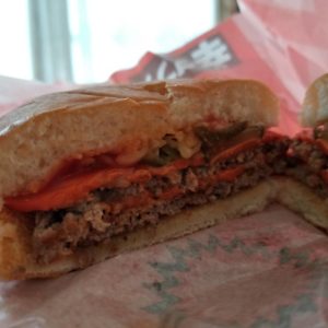 去年に引き続きまずこのチーズの色に驚きましたね。ピントが肉に当たってしまいちょいとボケてますがこのおどろおどろしい赤さは充分感じていただけるかと思います。